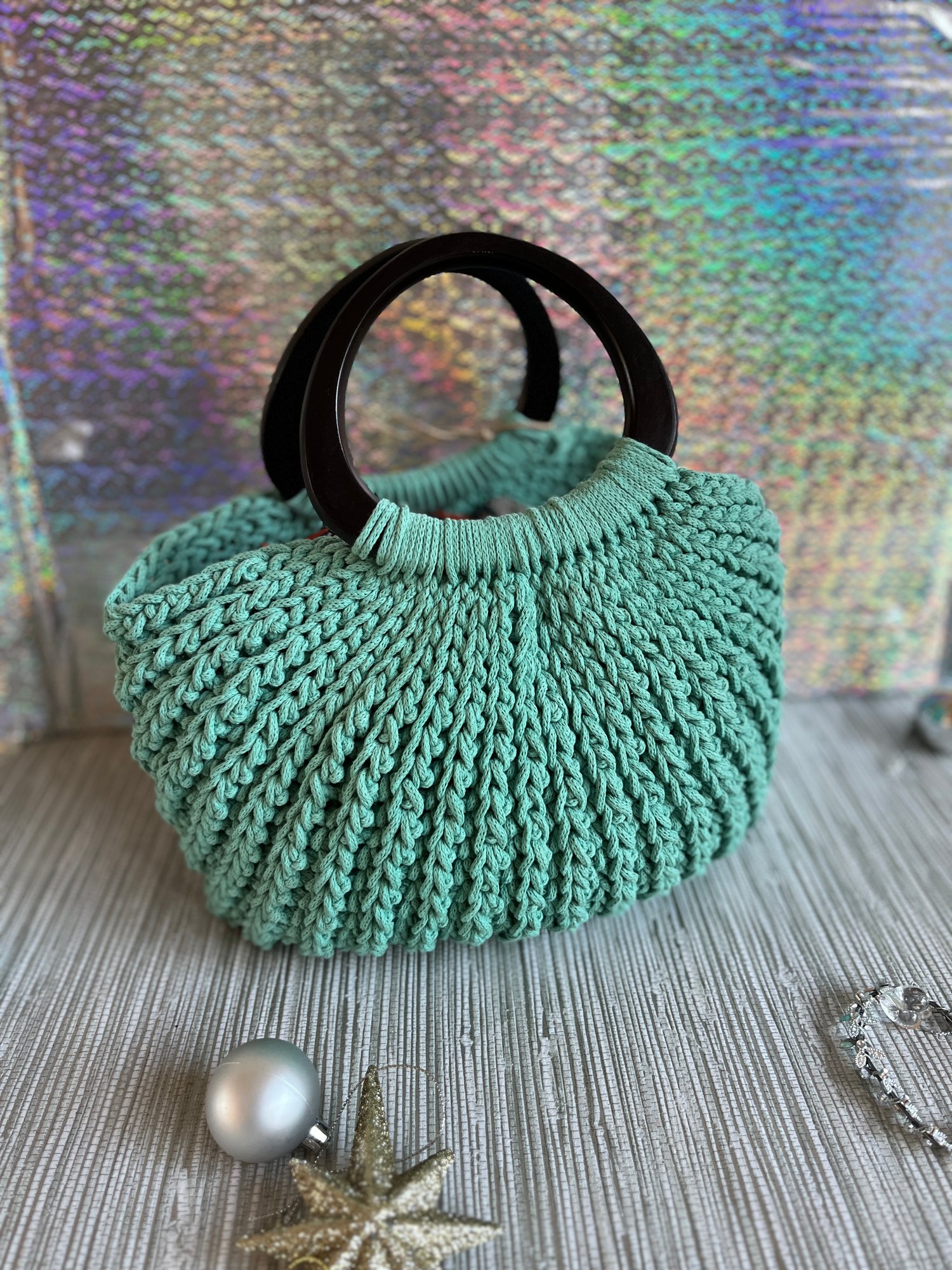 Care instructions: hand wash only, gently reshape and air dry. Not machine washable. Size: adult one-size handbag. Colour: green. Style: crochet knit-effect handbag with circular handles.