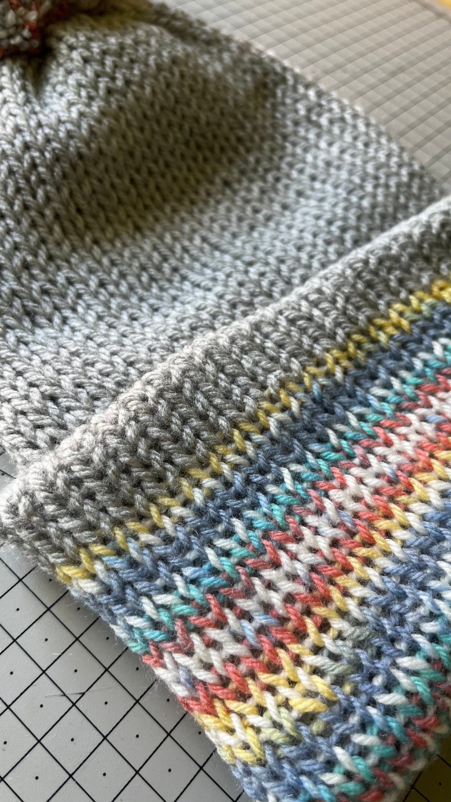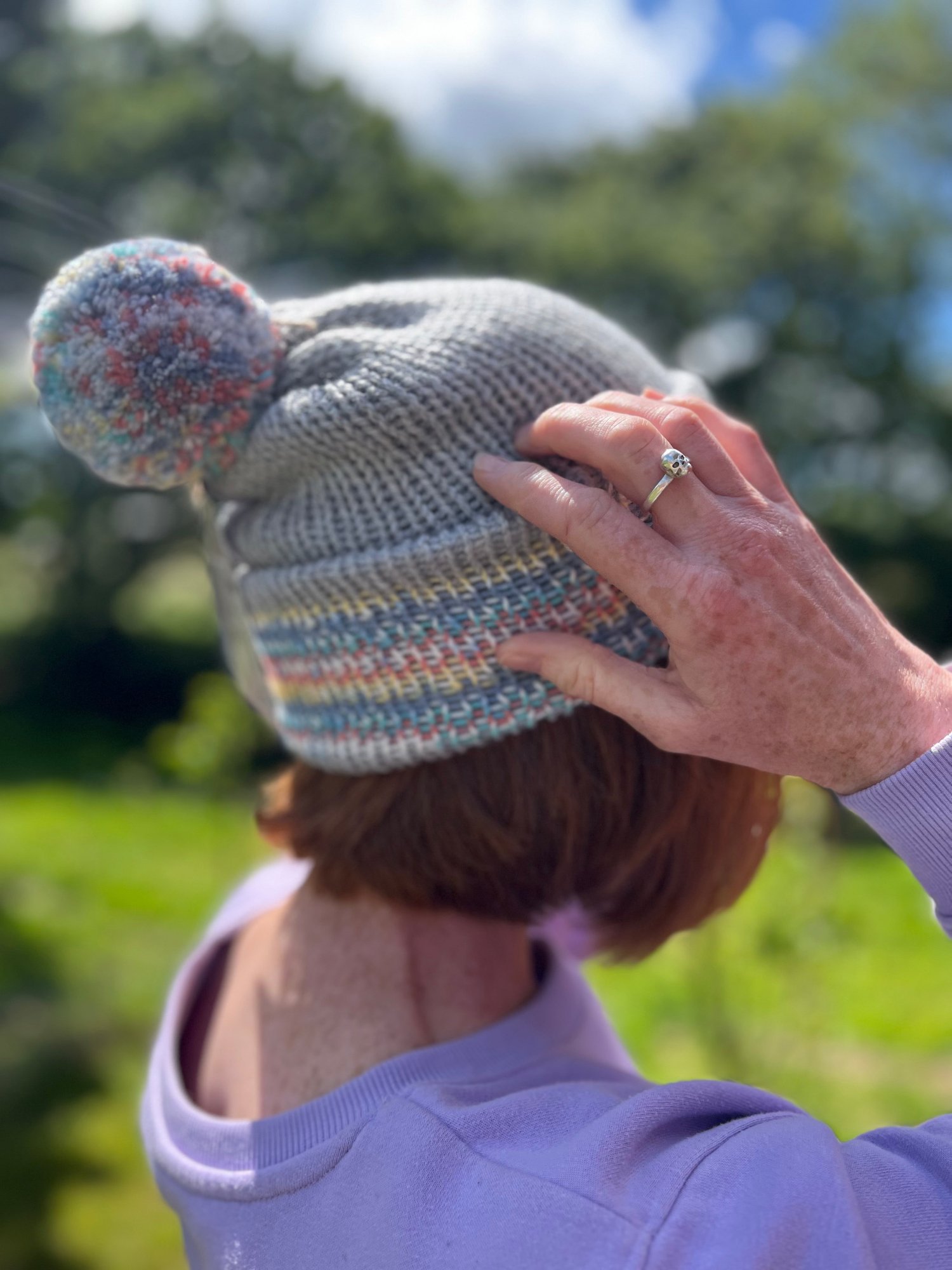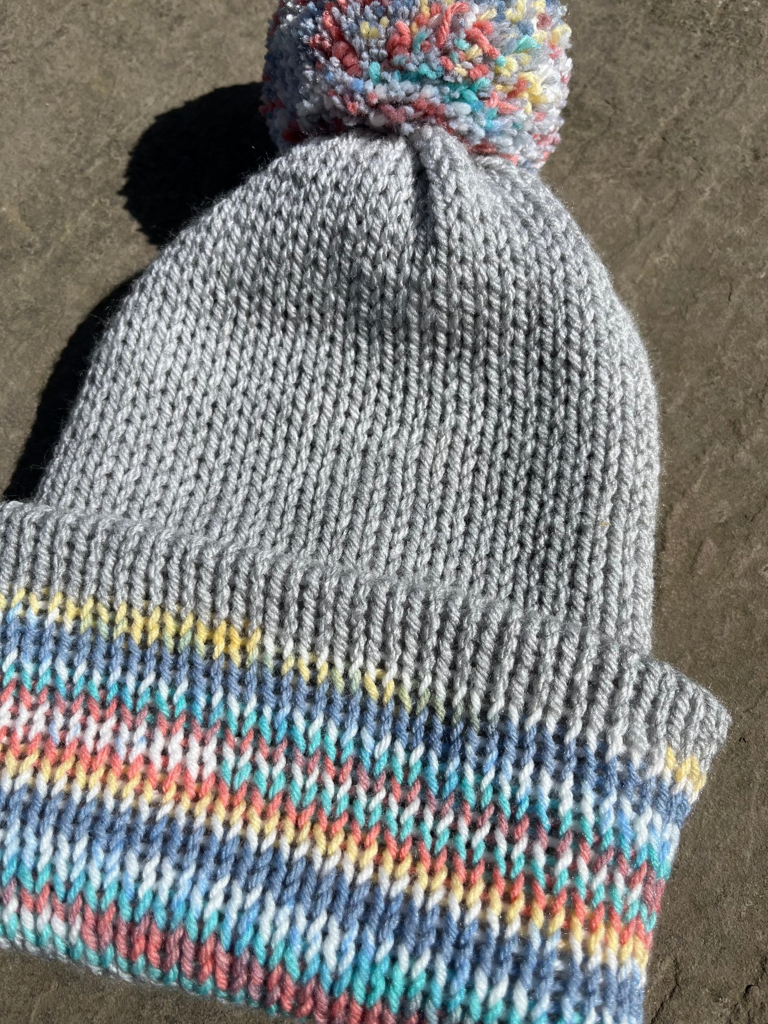 This versatile Grey and Pastel Spring Colours Knitted Hat!