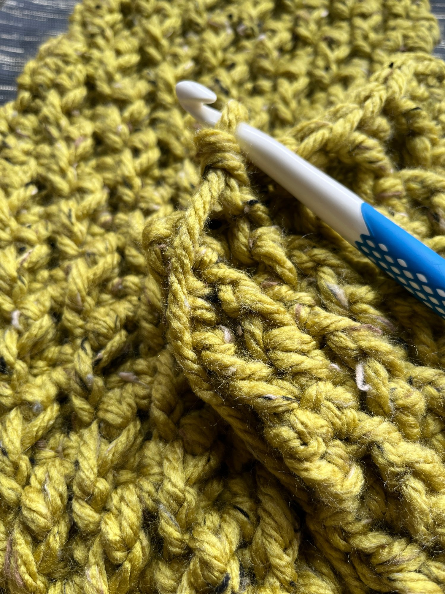Unlike long scarves that can catch in your coat zip, this cowl slips on easily, stays in place, and locks in warmth right where you need it. The Alpine stitch texture adds depth and interest, making it as eye-catching as it is practical.