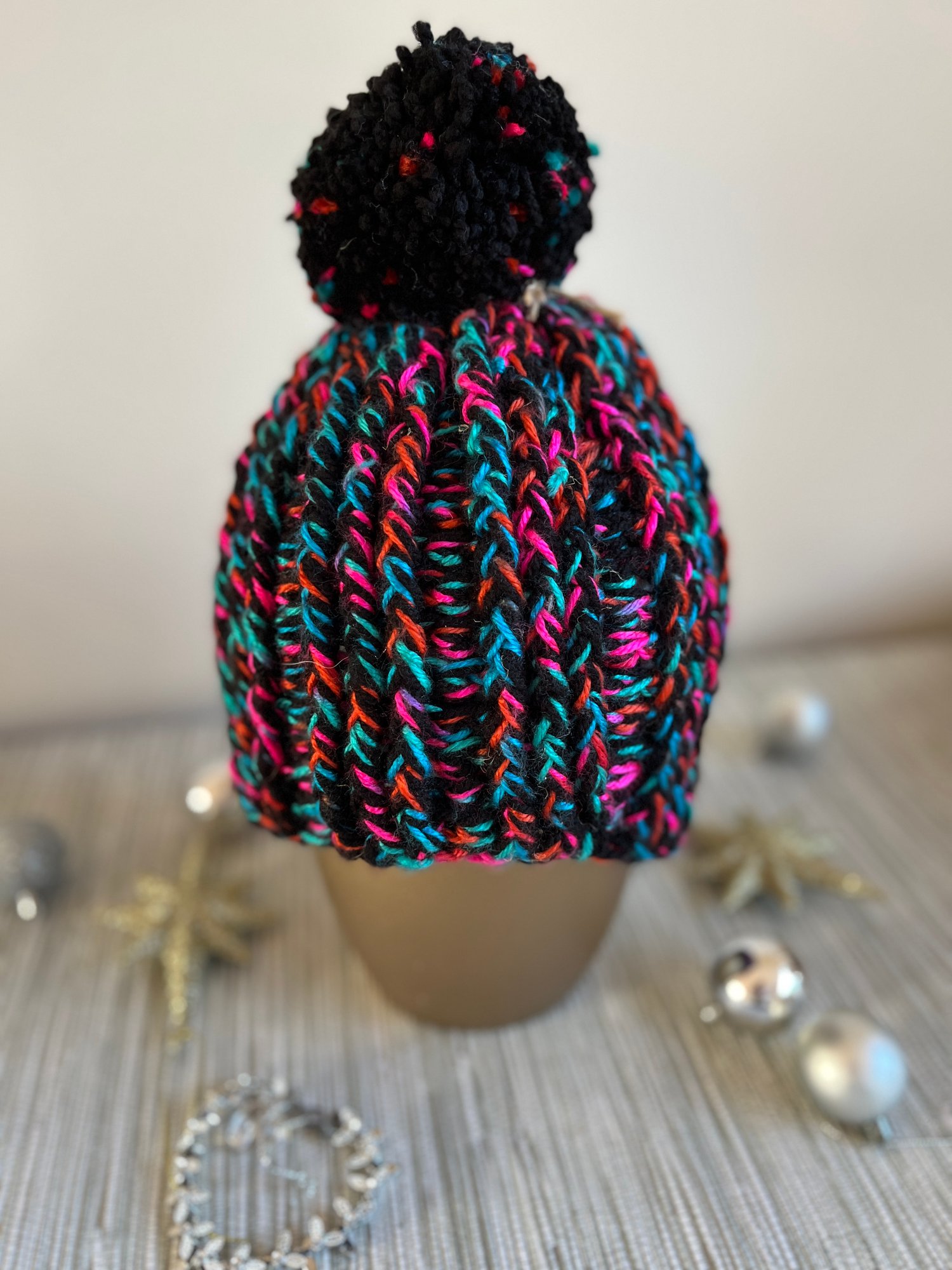 The Firework Nights Beanie is a bold, handmade crochet hat featuring a deep black base with vibrant flashes of pink, teal, blue and orange running throughout. Finished with a chunky black pom pom, this beanie has a fun, eye-catching look while still being practical and warm. Designed to fit a child age 5-10 years, it offers a snug yet comfortable fit, perfect for winter walks, festivals or everyday wear.